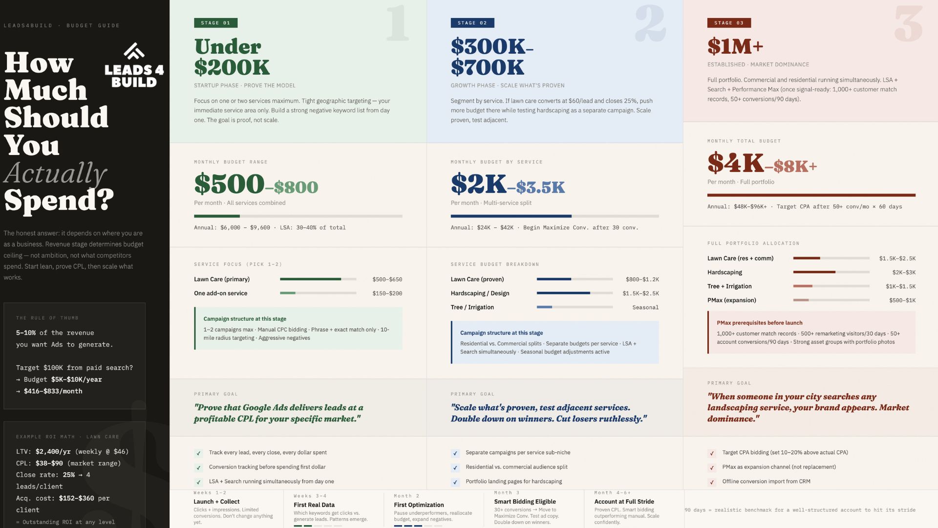 This is the structural playbook for Google Ads for landscapers. Not theory, not a list of “tips.” The exact campaign architecture, budget allocation, and seasonal adjustments that separate companies booking $50K months from those wondering why the phone stopped ringing.
