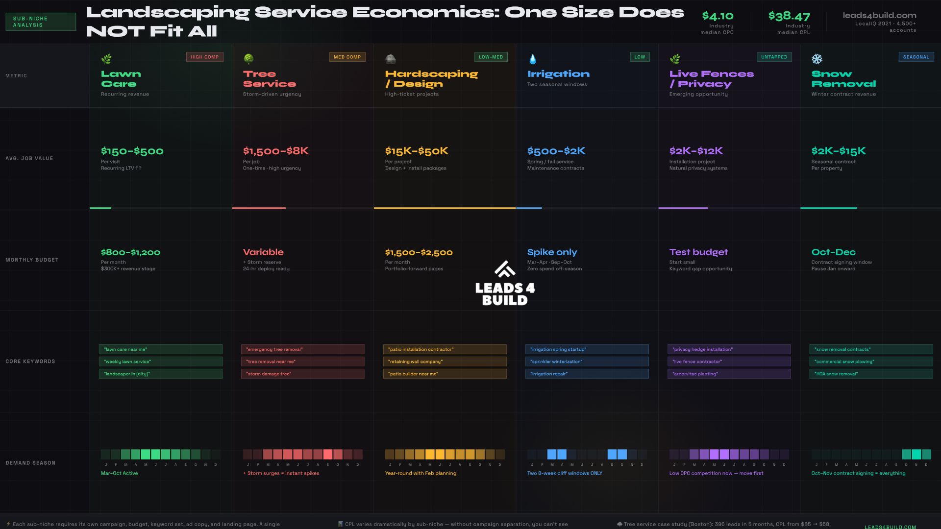 This is where most “Google Ads for landscapers” advice falls apart. Generic recommendations ignore the fact that lawn care, tree service, hardscaping, irrigation, and snow removal each operate on completely different economics. One campaign cannot serve all of them — and the numbers prove it.