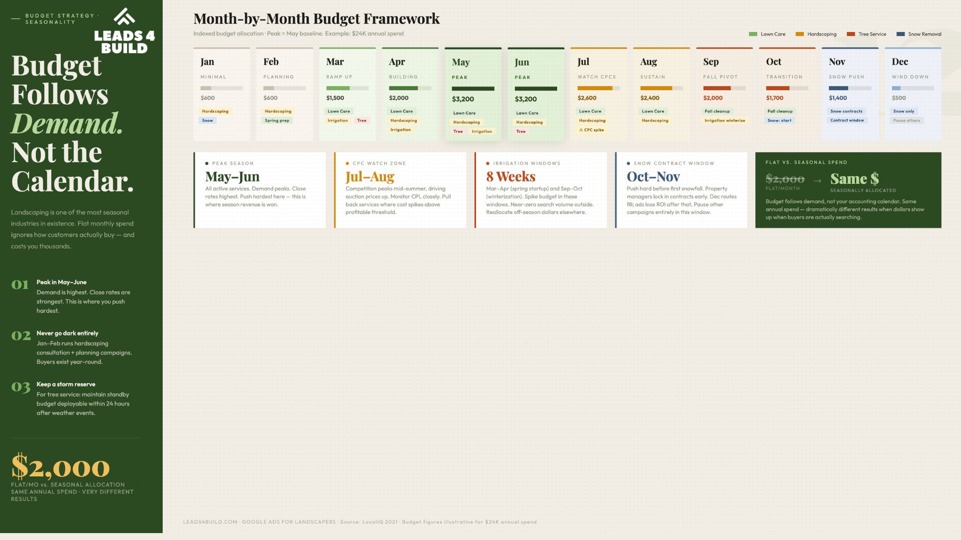Landscaping is one of the most seasonal industries in existence. Spending the same dollar amount in January as you do in May is not a strategy; it’s an accounting default that ignores how your customers actually buy.