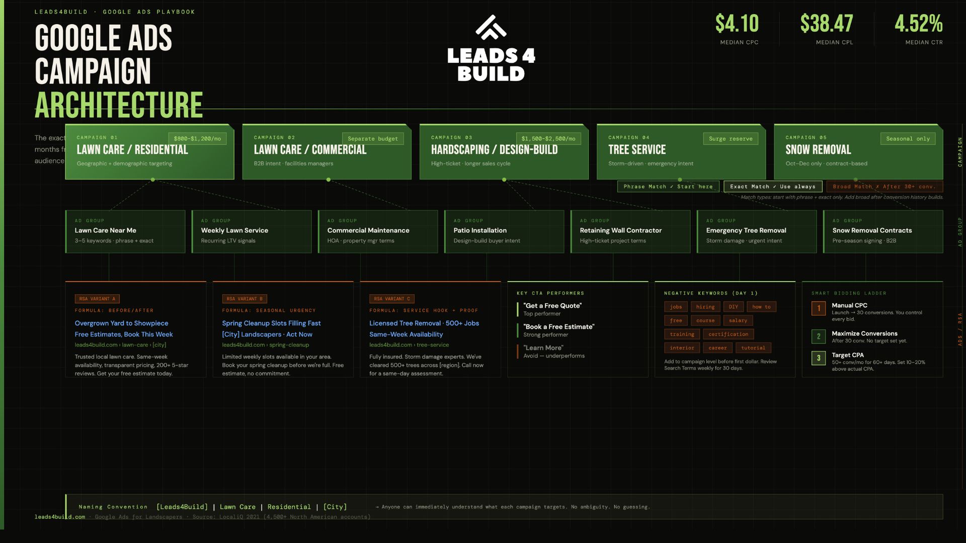 According to LocaliQ (2021), the median CPC for landscaping search advertising was $4.10 — though costs vary by sub-niche, geography, and competition level, and have trended higher in subsequent years. With proper structure, you’ll see exactly where your CPCs fall by service, audience, and geography.